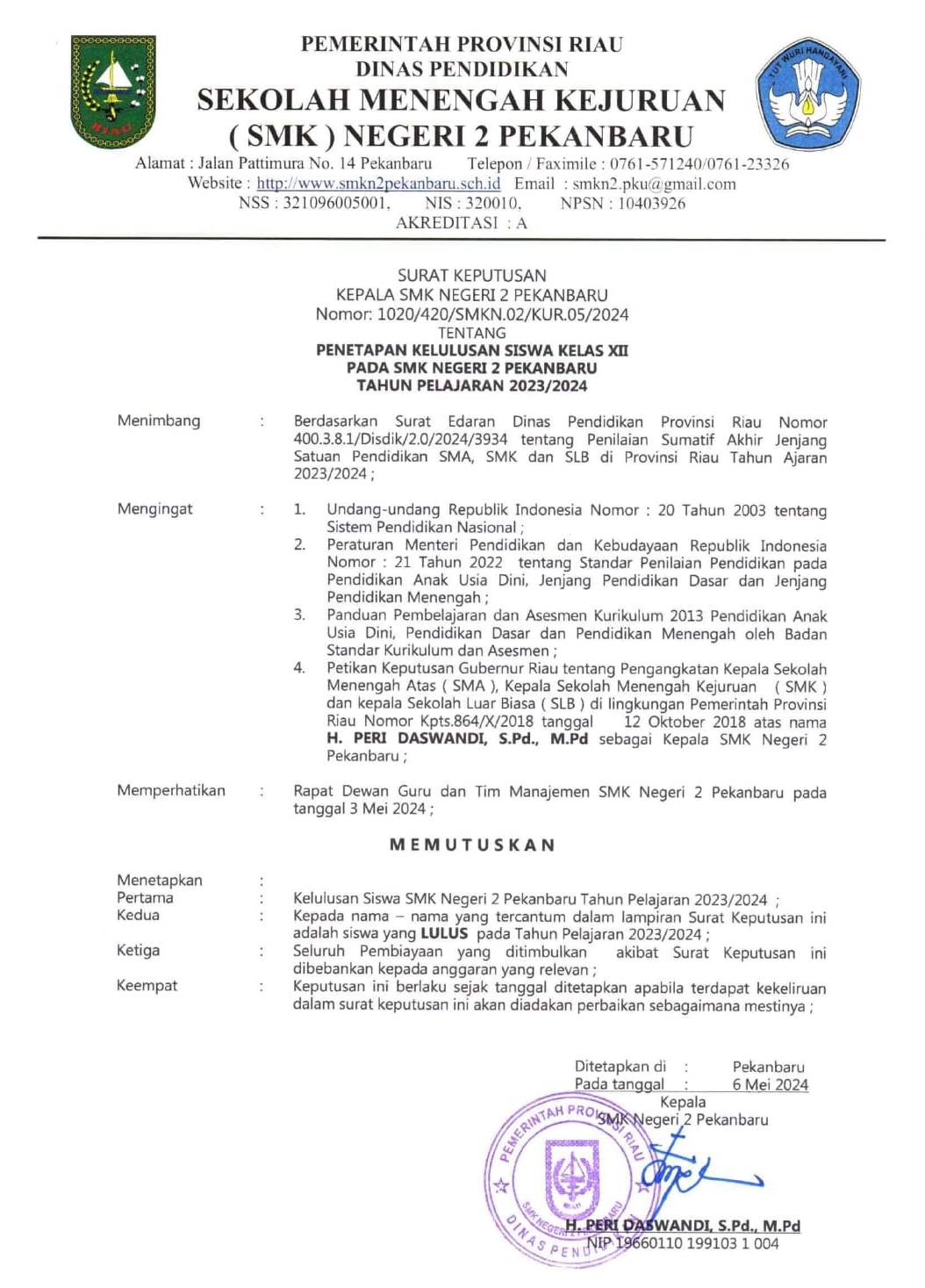 Bersyukur kita kepada Allah SWT Tuhan Yang Maha Esa, atas selesainya proses kegiatan pembelajaran di sekolah tepat pada waktu sesuai dengan yang direncanakan. Dan hari ini di lakukan pengumuman kelulusan bagi siswa/i SMK Negeri 2 Pekanbaru kelas XII TP. 2023/2024.