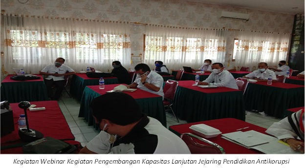 Pelaksanaan Kegiatan Pengembangan Kapasitas Lanjutan Jejaring Pendidikan Antikorupsi yang dilaksanakan atas dasar Surat Komisi Pemberantasan Korupsi Republik Indonesia Nomor : UND/1077/DKM.00.01/80-82/2021 tanggal 10 Agustus 2021, yang dilaksanakan secara via aplikasi zoom dengan metode Webinar selama 2 (dua) hari yaitu Selasa s/d Rabu (tanggal 07 s.d 08 September 2021) mulai dari jam 08.00 WIB s/d 13.00 WIB.