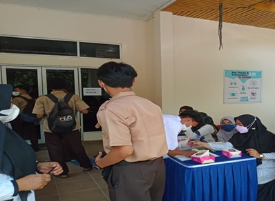 Kehadiran siswa dibagi kepada 3 (tiga) sesi antara berdasarkan kelas yaitu sesi pertama kelas X, dilanjutkan sesi kedua kelas XI dan setelah selesai ISOMA siang, dilanjutkan kelas XII. Antusiasme kehadiran siswa untuk ambilbagian pada kegiatan vakinasi sangat terasa, yaitu sejah pukul 7.30 WIB siswa mengantri secara rapi dan berjarak sesuai dengan prokes COVID 19 yaitu Jaga Jarak dan Cuci Tangan Pakai Sabun dan memakai masker merupakan harga mati pada pelaksanaan vaksinasi kali ini. Peran wali kelas dalam hal pengkondisian siswa untuk mendaftar dan agar siswa dapat mentaati prokes sangat membantu, sebanyak 72 walikelas secara bergantian dan cakap dalam melakukan registasi anak-anaknya dimulai sejak pagi hingga sore harinya.
