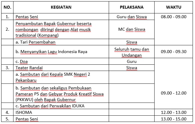 Pada kata sambutan Kepala Sekolah SMKN 2 Pekanbaru menyebutkan kegiatan ini menampilkan hasil karya siswa/i produk kreatif dari masing-masing jurusan dan juga menampilkan berbagai pertunjukkan seni dari siswa/i, Bapak kepala sekolah juga menyampaikan bahwa kegiatan ini adalah baru pertama dilakukan, diharapkan kegiatan ini nantinya menjadi kegiatan rutin yang dilakukan, serta kegiatan Gebyar P5 dan produk kreatif dan inovatif dapat bermanfaat bagi masyarakat dan hasil karya dapat dipasarkan didunia kerja. Setelah itu, pada kata sambutan Bapak Plt. Kepala Dinas Pendidikan Provinsi Riau Bapak M. Job Kurniawan, AP., M.Si, Bapak Kadisdik sangat mengapresiasi kepada pihak sekolah yang telah menggelar kegiatan Gebyar P5 dan Gebyar Produk Kreatif Siswa yang menampilkan produk hasil kreatif siswa/i SMKN 2 Pekanbaru dari setiap jurusan dan penampilan seni. Serta tidak lupa Bapak Kadisdik berpesan kepada seluruh siswa/i untuk terus belajar dengan giat dan menguasai teknologi yang paham digital sehingga mampu bersaing secara global dan dapat diserap didunia Industri baik didalam negeri maupun luar negeri. Setelah memberikan sambutan, Bapak Kadisdik membuka acara secara resmi dengan menggunting pita kemudian Bapak kadisdik dan rombongan berjalan menuju pameran, bazar dan kuliner.